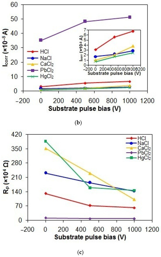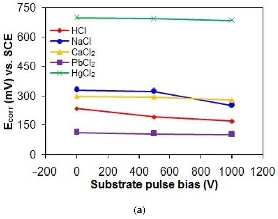 The Ecorr, Icorr, and Rp values of the taC thin films measured in the PbCl2 solution are 116 mV vs. SCE, 35.23 × 10−8 A, and 11.55 × 104 Ω; 108 mV vs. SCE, 48.28 × 10−8 A, and 9.18 × 104 Ω; and 105 mV vs. SCE, 51.17 × 10−8 A, and 8.48 × 104 Ω for the substrate pulse biases of 0 V, 500 V, and 1000 V, respectively, which are indicative of their highest corrosion in the PbCl2 solution. During shifting the potential from negative to positive values, the reduction of Pb2+ ions (PbCl2 → Pb2+ + 2Cl−) in the solution deposits Pb atoms on the film surfaces via Pb2+ + 2e− → Pb, so Pb deposits contribute to the overall anodic currents of the films via an anodic reaction of Pb → Pb2+ + 2e−, resulting in the highest corrosion of the films in the PbCl2 solution [52,53]. The lowest positive Ecorr values of the taC thin films in the PbCl2 solution are also probably attributed to the corrosion potential of Pb deposits on their surfaces [52,53].