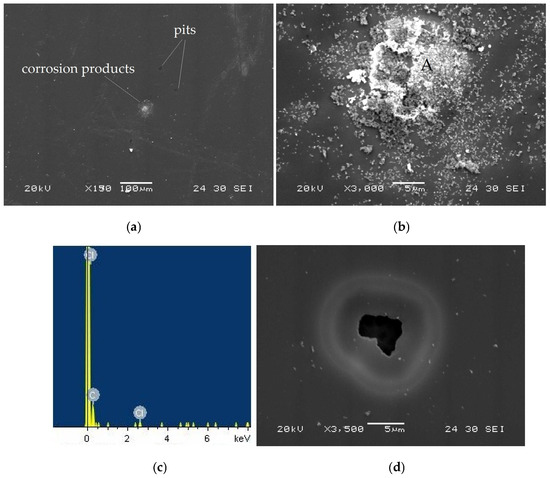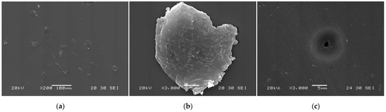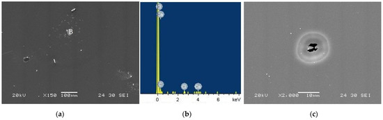 In Figure 11a, the taC thin film with 1000 V tested in the NaCl solution does not have any apparent corrosion-induced surface damage except for corrosion products. The corrosion products formed on its surface in the NaCl solution (Figure 11b) are apparently dense, probably due to the formation of salt crystals via ionic attraction between Na+ and Cl− species adsorbed on its surface [59]. The observation of a pit on its surface (Figure 11c) is indicative of its susceptibility to pitting corrosion in the NaCl solution, but it seems to be less severe compared to the one in Figure 10d as a result of the lower anodic dissolution of the film in the NaCl solution.