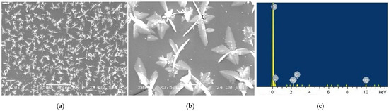 (a,b) Surface morphologies of taC thin film with a substrate pulse bias of 0 V observed at different magnifications after potentiodynamic polarization measurement in a 5 × 10−2 M HgCl2 solution and (c) EDS spectrum measured at location “C” in (b).