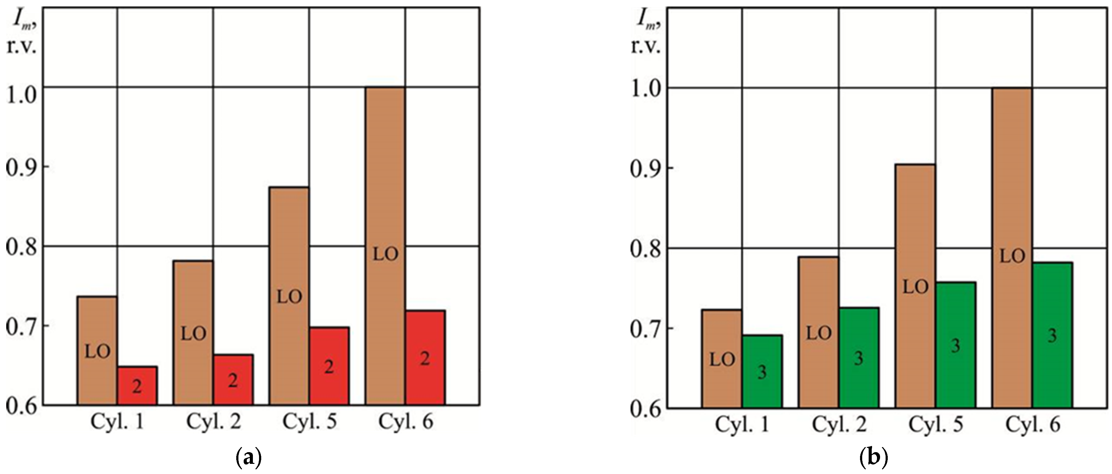 92]. In this case, the bearing inserts of the cylinders located closer to the load consumer (propeller or electric generator) have greater wear compared to the inserts that are further away from the load consumer.