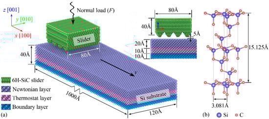 The MD model of 6H-SiC sliding on a Si substrate, implemented using the Large-scale Atomic/Molecular Massively Parallel Simulator (LAMMPS) [], is shown in Figure 1a. The simulation results were visualized using Ovito Basic v3.5.3 []. The Si substrate has a box size of 1000 Å × 120 Å × 40 Å, containing 245,978 atoms. The upper surface of the Si substrate is the (001) crystal plane, with a 10 Å thick boundary layer at the bottom to ensure that the substrate is not moved by the slider during sliding. Adjacent to the boundary layer is a 10 Å thick thermostat layer, using the Langevin equation []. Above the thermostat layer is a 20 Å thick Newtonian layer, where atoms follow Newton’s second law []. The 6H-SiC slider size is 80 Å × 80 Å × 40 Å, which is the average height of 40 Å. The slider contains approximately 24,000 atoms, with the upper surface being the (0001) crystal plane []. The crystal structure of 6H-SiC is shown in Figure 1b. Periodic boundary conditions are applied in the x and y directions, while non-periodic and shrink-wrapped boundary conditions are applied in the z direction. The angular momentum of the 6H-SiC slider is set to 0, so it is only influenced by forces and not by torques to prevent rolling during sliding. Based on mechanical properties research [,] considering crystal orientation, the Vickers hardness (HV) of 6H-SiC [] is more than 2700, while that of single-crystal [] silicon does not exceed 1400. Consequently, the 6H-SiC slider is treated as a rigid body, focusing solely on surface damage to the Si substrate. A plane slider’s bottom surface is used as a reference, while the bottom surface of the non-flat slider is determined by the following formula: