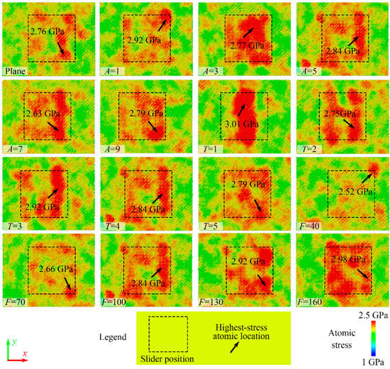 Figure 4 shows the von Mises stress distribution of the substrate surface during 120 ps of sliding. In the figure, the substrate has a length of 150 Å in the x direction, and the black dashed box indicates the position of the slider at that time. The black arrow points to the location of the maximum von Mises stress on the substrate. Under all the parameters, the maximum von Mises stress remains below 3 GPa, which does not induce dislocation formation within the substrate. Consequently, dislocation analysis is excluded from this study. For the plane slider, the maximum stress in the substrate is 2.76 GPa, located in the central front part of the slider. Notably, the stress in the area directly below the center of the plane slider is significantly smaller than the stress around it, indicating that the real contact area of two perfectly flat surfaces is also smaller than the nominal contact area at the microscopic scale. For sliders with amplitudes A = 1, 3, 5, 7, and 9 Å, the maximum stresses in the substrate are 2.92, 2.77, 2.84, 2.63, and 2.79 GPa, respectively. For amplitude parameters, higher stresses occur consistently under the slider peaks, though no obvious pattern emerges in maximum von Mises stress values. For sliders with periods T = 1, 2, 3, 4, and 5, the maximum stresses in the substrate are 3.01, 2.75, 2.92, 2.84, and 2.79 GPa, respectively. Similar to sliders with different amplitudes, the maximum stress region is beneath the first peak of the slider’s bottom surface. Additionally, the stress distribution in the substrate for sliders with T = 1 and 2 clearly shows the contact area. Regarding periodicity, increased periods distribute the normal load more evenly, thereby reducing von Mises stress. Wu et al. [] demonstrated that wear strongly depends on sinusoidal surface topography. Our results align with theirs. Moreover, periodicity exerts a greater influence on stress and wear than amplitude at the atomic scale. Under F = 40, 70, 100, 130, and 160 nN, the maximum stresses in the substrate are 2.52, 2.66, 2.84, 2.92, and 2.98 GPa, respectively, with the maximum stress region beneath the first peak of the slider’s bottom surface. For normal load, von Mises stress exhibits a linear correlation. Temperature contour maps closely align with von Mises stress contour maps. When slider atoms approach excessively close to each other, adjacent substrate atoms experience significant repulsion, deviating from their original lattice positions. Atomic motion induces temperature elevation.