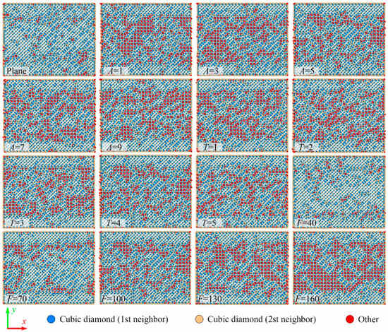 Partial substrate surface atoms undergo phase transformations under moderate von Mises stresses. Figure 5 illustrates the phase changes of substrate atoms during 120 ps of sliding. This figure shows the substrate with a length of 150 Å in the x direction. The atoms in the phase transition are highlighted in red. In monocrystalline silicon, the internal atoms exhibit a cubic diamond structure. To avoid excessive color complexity, atoms with cubic diamond structures were removed to facilitate clearer observation of phase-transition atoms. It is found that the crystal of some surface atoms changes from a cubic diamond (first or second neighbor) to an amorphous structure (other) when the slider moves across them. Regardless of parameters, only surface-layer atoms exhibit amorphization. After the slider passes, some amorphized atoms revert to cubic diamonds (first or second neighbor). The wear occurs due to the deformation of the top layer of silicon atoms, similar to previous findings [].