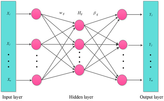 When discussing the construction of a neural network, we first set the input vector as and the output vector as and determine the number of neurons l in the hidden layer as well as the chosen activation function . Referring to the schematic diagram in Figure 2, we can derive the output matrix Y of the network, as shown in Equation (13).