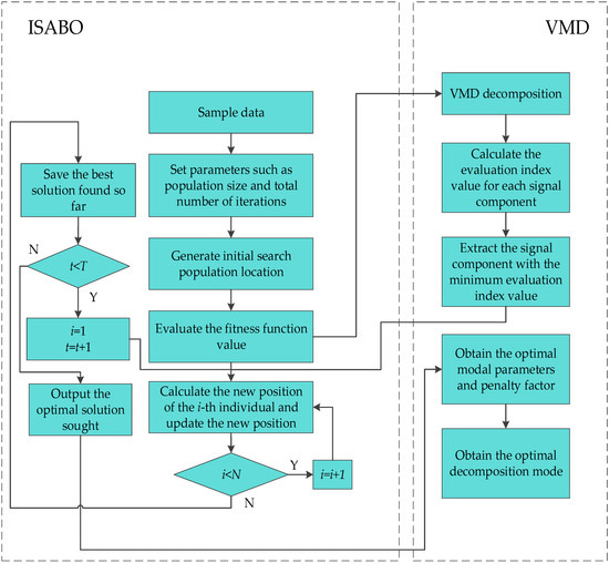 The specific steps of optimizing the VMD using the ISABO algorithm are as follows. Meanwhile, the framework of the ISABO-VMD algorithm is illustrated in Figure 3.