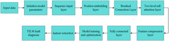 The fault detection system designed in this study aims to fully exploit the synergistic effects of Transformer and TELM, with the former dedicated to extracting high-dimensional features and the latter to achieving efficient classification. Specifically, the Transformer network employs a multi-layer architecture, comprising a sequence input layer, a positional embedding layer, residual connection layers, two levels of self-attention layers, and a feature compression layer. The sequence input layer accepts feature vectors of variable dimensions and maps them into an initial sequence representation. Subsequently, the positional embedding layer adds positional information with a maximum positional encoding length of 16 to the input sequence through a learnable embedding matrix, capturing the relative positional characteristics of the temporal signals. The sequence input layer accepts feature vectors of variable dimensions and maps them into an initial sequence representation. The positional embeddings are merged with the input features via an addition layer. This forms residual connections, enhancing information propagation. Next, the model includes two self-attention layers, utilizing causal self-attention and regular self-attention mechanisms, respectively. The causal attention ensures that the model only focuses on information from the current and previous time steps through a masking mechanism, while the regular attention is used for global feature interaction. Each attention layer contains four processing units, with a key vector dimension of 64 per unit, totaling 256 dimensions, to enhance the model’s parallel processing capabilities. Following this, the feature compression layer reduces the high-dimensional attention output to 20 dimensions through a fully connected layer. After inhibiting overfitting via a Dropout layer, the temporal index layer extracts the features at the end of the sequence as the global representation. Finally, this representation is mapped to a four-dimensional fault category space through another fully connected layer, completing end-to-end feature extraction. The output is then converted into a probability distribution via a Softmax layer, and the classification output layer generates category labels. After training, features are extracted from the second fully connected layer and input into TELM for fault classification. The framework of the Transformer-TELM algorithm is illustrated in Figure 4.