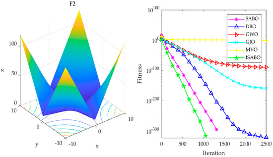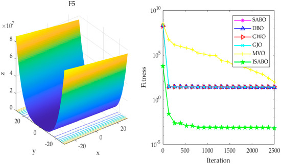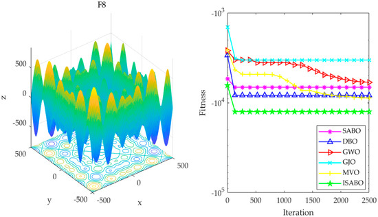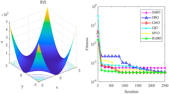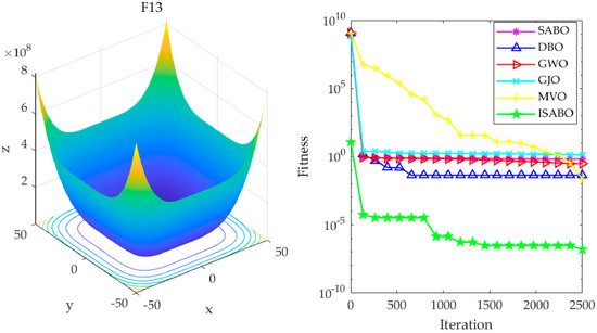 To evaluate the effectiveness of the ISABO algorithm in the field of optimization, this study designed comparative experiments. In these experiments, the ISABO algorithm was compared with several well-known optimization algorithms, including the traditional SABO, as well as the recently highlighted Grey Wolf Optimizer (GWO), Golden Jackal Optimization (GJO), Multi-verse Optimization (MVO), and dung beetle optimizer (DBO) [31,32,33,34]. The dataset selected for the experiments was CEC2005, from which six challenging benchmark test functions were meticulously chosen as benchmarks for evaluating algorithm performance. The CEC2005 test suite is a standard dataset released by the IEEE (Institute of Electrical and Electronics Engineers) congress on evolutionary computation (CEC) in 2005 for evaluating the performance of optimization algorithms. It is designed to assess and compare the performance of different optimization algorithms. This test suite includes a series of standard test functions specifically designed to evaluate the performance of optimization algorithms, and it is widely used to assess the performance of various optimization algorithms, particularly evolutionary algorithms.