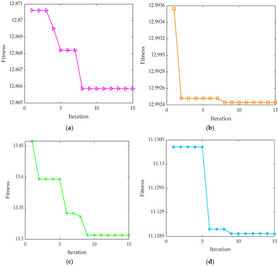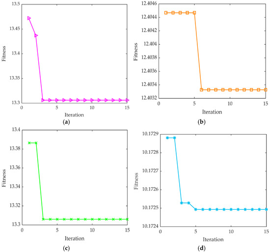 At this juncture, to further evaluate the performance of the proposed method under different noise environments, this study intentionally introduced noise interference. The noise was at two different intensities, namely −2 dB and −7 dB, and was added to four types of bearing operating condition signals. This was aimed at simulating the diverse noise conditions that may be encountered in practical applications, thereby enabling a more accurate assessment of the method’s robustness. Subsequently, relying on the optimization capabilities of the ISABO algorithm, a systematic search for optimal parameters in the VMD algorithm was conducted. During the optimization process, a rigorous scientific attitude was maintained, and the ratio of the envelope entropy to the envelope Gini coefficient was selected as the fitness function to ensure that the algorithm could accurately and sensitively reflect the actual effects of parameter optimization. The search range for the VMD parameters remained consistent with the previous settings to ensure the rationality of the parameter search. Under the interference of noise at −2 dB and −7 dB intensities, the trend in the fitness curves of the ISABO optimization algorithm was closely observed in the experiments, as clearly shown in Figure 20 and Figure 21. From these figures, it is evident that regardless of the noise intensity, the fitness curves exhibited trends of rapid convergence to varying degrees and found the optimal fitness values under their respective noise conditions. After optimization using ISABO, the optimal combinations of the VMD parameters for different noise conditions were obtained and are detailed in Table 4. These optimal parameter combinations provided strong support for subsequent bearing signal processing and analysis.