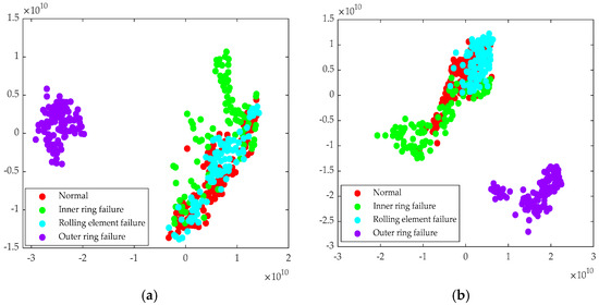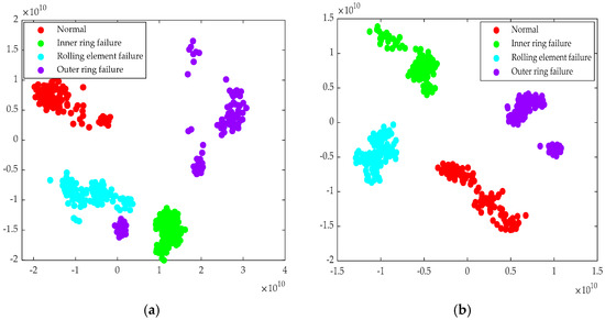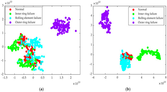 To validate the feature learning capability of the model proposed in this paper, this study employed the t-distributed stochastic neighbor embedding algorithm (t-SNE) to reduce the dimensionality of the high-dimensional features output by the final fully connected layer of the Transformer model. During the experiment, the characteristic parameter values of some signals extracted under different decibel noise levels are shown in Table 5 We have cited Figure 2 in the main body of the paper.These reduced features were then visualized. Figure 24, Figure 25 and Figure 26 present comparative results of two-dimensional projections of the original data versus the data enhanced by the Transformer features under different noise intensities. In the absence of noise (Figure 24), the features of the original data samples did not overlap (Figure 24a). However, the clustering of features under different operating conditions was not ideal. In contrast, the feature space processed by the Transformer network (Figure 24b) exhibited relatively clear class separability. Four bearing conditions (normal, inner race fault, outer race fault, rolling element fault) basically formed independent clusters. This was attributed to the Transformer structure effectively aggregating global contextual information through the self-attention mechanism. Meanwhile, as the noise intensity increased to −2 dB (Figure 25) and −7 dB (Figure 26), the feature distribution of the original data underwent significant degradation. In particular, under strong −7 dB noise interference (Figure 26), the feature points of various categories mostly overlapped, posing considerable challenges for fault identification using traditional signal processing and pattern recognition methods. In contrast, the feature space enhanced by the Transformer (Figure 25b and Figure 26b) maintained relatively high intra-class compactness and inter-class separability to some extent. This demonstrates that the multi-head self-attention mechanism enhanced the model’s robust representation ability for key discriminative features under noise interference through parallel feature interactions.