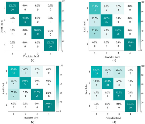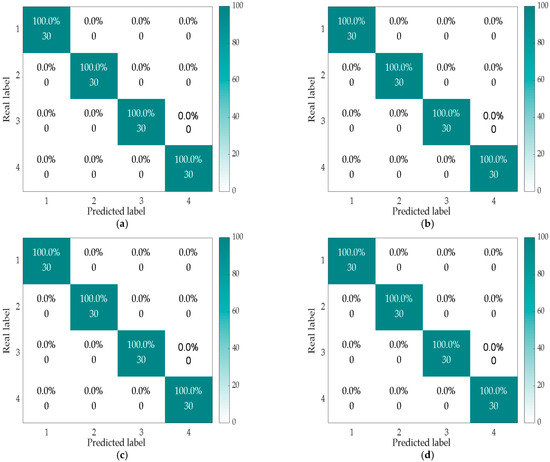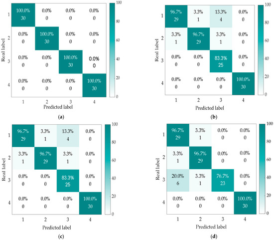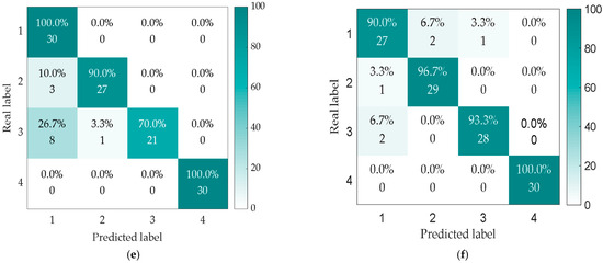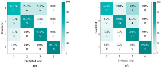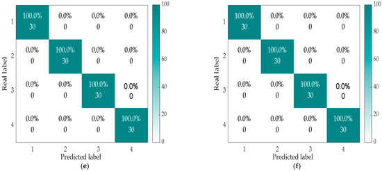 Fault diagnosis results based on recognition models using TELM (a), KELM (b), ELM (c), SVM (d), Softmax (e), and CNN (f) under −2 dB noise addition.