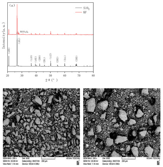 The crystalline structure and chemical composition of gold mine tailings and SiO2 particles were characterized using X-ray diffraction (XRD). As shown in Figure 1a, the primary diffraction peaks of the gold mine tailings—specifically (100), (101), (102), (110), (202), (200), (112), (201), and (203)—closely resemble those of the standard SiO2 diffraction pattern, indicating that SiO2 was the dominant component of the tailings. Additionally, the XRD analysis revealed the presence of minor quantities of illite, chlorite, potassium feldspar, plagioclase, and iron dolomite in the tailings. Figure 1b,c show scanning electron microscopy (SEM) images of the SiO2 and tailings, respectively. The SiO2 particles exhibited a relatively uniform size distribution, whereas the tailings consisted of both large particles and a considerable amount of finer materials.