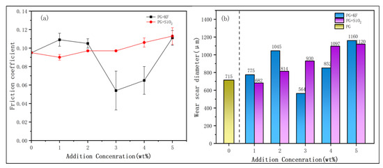 - The addition of SiO2 and tailings, when used separately, significantly reduced both the COF and WSD of the base PG. At a SiO2 concentration of 1%, optimal tribological performance was observed, with reductions of 5.3% and 4.6% in the COF and WSD, respectively, relative to the base grease. In contrast, the best performance with tailings was achieved at a concentration of 3%, corresponding to reductions of 43.2% in the COF and 21.1% in the WSD compared with the base grease.