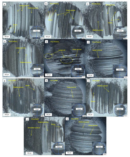 High- and low-magnification micrographs of the wear surfaces: (a) PG; (b) PG + 1% SiO2; (c) PG + 2% SiO2; (d) PG + 3% SiO2; (e) PG + 4% SiO2; (f) PG + 5% SiO2; (g) PG + 1% KF; (h) PG + 2% KF; (i) PG + 3% KF; (j) PG + 4% KF; (k) PG + 5% KF.