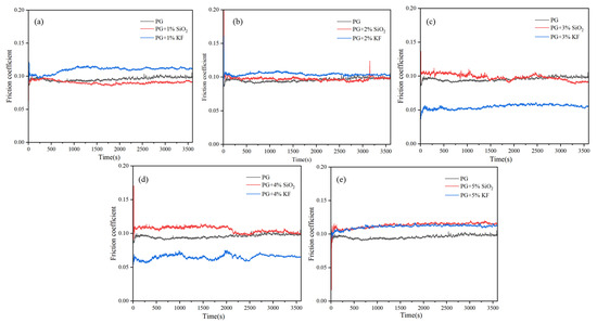 COF curves for the greases: (a) 1%; (b) 2%; (c) 3%; (d) 4%; (e) 5%.