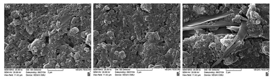 Figure 5 shows SEM images of the base grease, grease with 1% SiO2, and grease with 3% tailings. The microstructure of the base grease exhibits significant aggregation of thickener particles, characterized by numerous voids and irregular materials in various forms, including flakes and elongated shapes. This suggests that the additive was not uniformly mixed, resulting in incomplete dispersion, which led to an increase in cone penetration and a decline in the friction performance. With the addition of SiO2, the thickener exhibited a short-chain aggregation structure, while the irregular materials were absent. This indicated that the colloidal structure of the grease may have formed short-chain aggregates of varying sizes due to hydroxyl bonding on the surface of SiO2 and intermolecular forces. These aggregates interlinked to create a spatial framework that confined and stabilized the base oil, thus maintaining the integrity of the colloidal structure [7]. In the grease containing tailings, we observed not only the aggregates but also many elongated, plate-like materials. Previous analyses suggest that these materials were silicates and aluminosilicates, which enhanced the wear resistance of the grease [23].