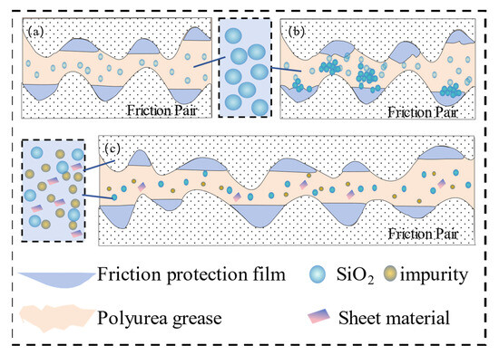 Friction mechanisms of tailings and SiO2 particles in the grease: (a) SiO2 are dispersed; (b) SiO2 is agglomerated; (c) tailings are dispersed.
