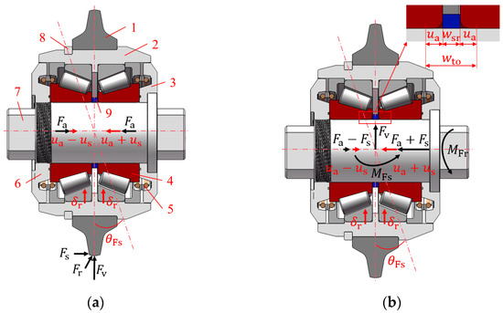 Cross-sectional view and force diagram of the disc cutter: (a) external forces loading; (b) load transmission and preload; 1—cutter ring; 2—cutter hub; 3—right end cap; 4—tapered roller bearing; 5—floating seal; 6—left end cap; 7—cutter shaft; 8—retaining ring; 9—spacer ring.