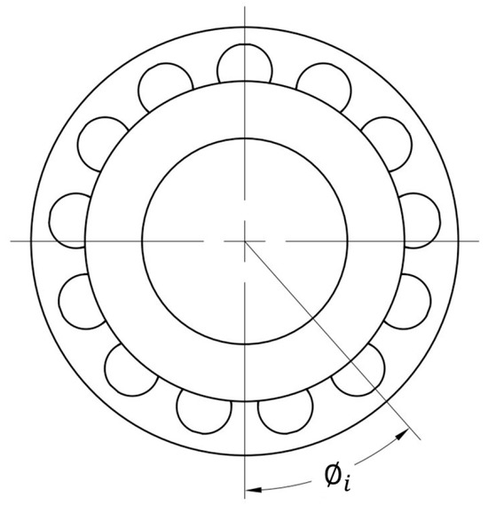As the disc cutter rotates during the rock-breaking process, the inner race of the bearing undergoes relative motion with the outer race. The force and deformation states of the bearing rollers and raceways change depending on the phase in which the rollers are positioned. Figure 2 shows a schematic diagram of the bearing roller phase angle, where represents the phase angle of the -th roller.