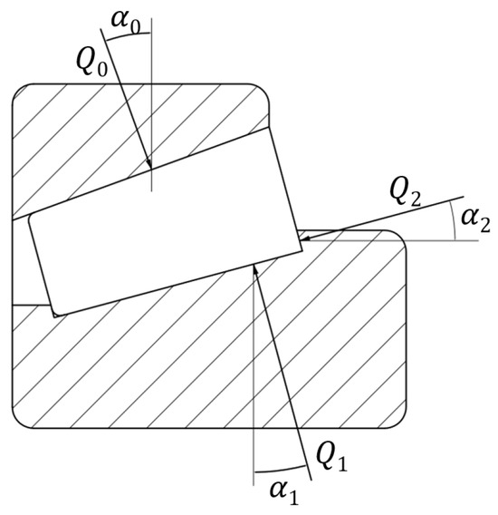 During the loading process of a tapered roller bearing, the force applied in a single direction is decomposed into other directions. Therefore, the force balance of the roller is the result of the combined action of multiple forces. As shown in Figure 4 the contact loads between the tapered roller and the outer ring, inner ring, and flange of the outer ring are denoted as , , , respectively, with corresponding contact angles , , . The contact angles are related to the roller’s half-cone angle and tilt angle.