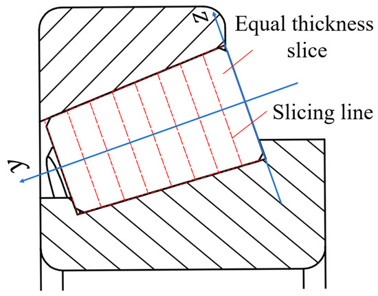 To calculate the rolling frictional torque, the deformation of a single roller is considered as the basis. Under the influence of both external loads and preloading, the tapered roller generates contact forces and deformations along the contact line. The rolling frictional torque of the roller is then calculated based on these contact forces and deformations. Finally, the rolling frictional torques of the pair of tapered rollers in the disc cutter are summed to obtain the total rolling frictional torque. The curvature of the tapered roller varies linearly at different positions along the rotating axis. The tapered roller is treated as a series of slices, with each slice assumed to have a constant curvature. The tapered roller is transformed into a combination of multiple cylindrical segments. The rolling frictional torque for each slice is calculated, and the total frictional torque of the tapered roller is obtained by summing the contributions from all slices [35,36]. The schematic diagram of the slicing process is shown in Figure 6.