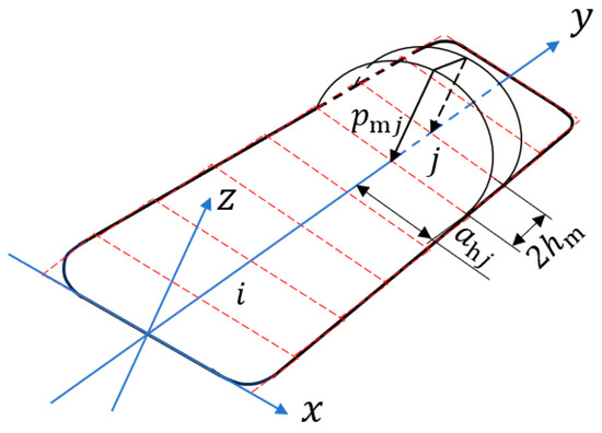 To calculate the loads , , and the maximum contact stress acting on a single slice, the tapered roller is divided into cylindrical slices, each with a width of . The corresponding contact region between the roller and the outer ring is divided into arch-shaped units, each with a width of . The load pressure within each arched element is uniformly distributed along the y-axis and exhibits a Hertzian distribution along the x-axis. The distribution is illustrated in Figure 8.