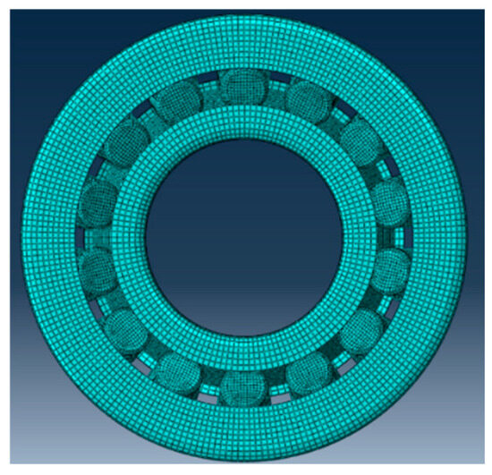 To enhance the quality of the mesh and ensure the finite element model produces accurate and reasonable results, hexahedral elements with better computational precision and anti-distortion performance were used for the mesh generation of all bearing components in HyperMesh. The 2D mesh nodes of the model were manually optimized to improve the mesh quality, ensuring more precise finite element calculations. The mesh quality parameters are shown in Table 2. After optimization, the bearing model contains 126,800 elements, all of which are 8-node hexahedral linear reduced-integration elements (C3D8R). The final finite element mesh model of the tapered roller bearing is shown in Figure 10.
