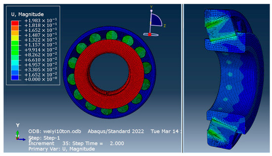Figure 17 shows a comparison between the experimental fitting curve and the simulation fitting curve. There is a certain difference between the experimental and simulation results, with an average relative error of approximately 13.6%. Overall, the experimental and simulation results are in good agreement, which validates the reliability of the preload force and preload displacement relationship in the simulation model.