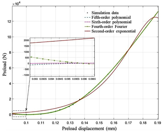 Figure 14 shows the curves obtained after fitting with different functions. Except for the exponential function, the other fitting functions coincide almost completely within the range of 0.11 mm to 0.1885 mm, with the main difference occurring between 0.09 mm and 0.11 mm. The fourth-order Fourier function shows that, in the low preload displacement range, the preload force initially decreases and then increases. However, in the actual bearing preload process, the preload force gradually increases in the low preload displacement range. The fourth-order Fourier function demonstrates overfitting. The trends of the fifth-order polynomial and sixth-order polynomial are generally consistent with the actual situation. From Table 3, the performance of the sixth-order polynomial is superior to that of the fifth-order polynomial. Therefore, the sixth-order polynomial is considered the optimal fitting function.