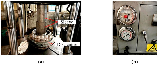 As shown in Figure 15, the experimental setup includes a hydraulic press with a maximum working pressure of 100 tons and a control accuracy of 0.5 tons. The experimental disc cutter consists of only the bearing, cutter hub, and cutter ring. The bearing inner ring base is placed on the hydraulic press, and the disc cutter is then positioned on the base, as shown in Figure 16a. The other end of the disc cutter’s bearing inner ring is connected to the hydraulic press through a sleeve. During the experiment, preload is applied to the bearing in the disc cutter by loading through the hydraulic press.