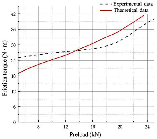 In the same five sets of preload forces and no-load conditions as the experiment, the bearing friction torques are calculated using the theoretical model. Table 7 shows the constant parameter values used in the theoretical model. Figure 19 shows a comparison between the theoretical and experimental values of the bearing friction torque. At a preload force of 5 kN, the maximum discrepancy between the experimental and theoretical friction torque is observed, with a maximum error of approximately 5 N∙m. As the preload force increases, the error between the theoretical and experimental values initially decreases and then increases, eventually reaching a fixed value. The average relative error is approximately 13.3%, which validates the reliability of the bearing rolling friction torque model.