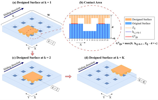 Figure 1 illustrates our notation and the contact area as the designed surface slides along the X axis. Figure 1a illustrates the original surface (in the bottom) and the designed surface (in the top) at position , and before sliding begins. Figure 1b illustrates the contact area between two surfaces, notations we use, and our calculations of the contact area. Figure 1c,d illustrate the two surfaces in contact in positions and during sliding of the designed surface along the X axis. This example illustrates a surface with dimples. Similar notation and modeling can be used for surfaces that have pillars.
