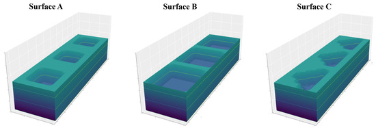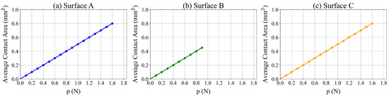 We conduct a sensitivity analysis to determine the impact of the normal unit load on contact (p) on the average contact area. In these experiments, the value of p varies from 0 to 1.6 Newton (N). The total load depends on the dimensions of the designed surface. The results of these experiments are summarized in Figure 5. These results indicate that the average contact area increases with p. Additionally, the maximum unit load for Surfaces A and C is 1.6 N and the average contact area is 0.8 mm. For Surface B, the corresponding values are 0.9 N and 0.5 mm. Larger loads would lead to deformation of the texture.