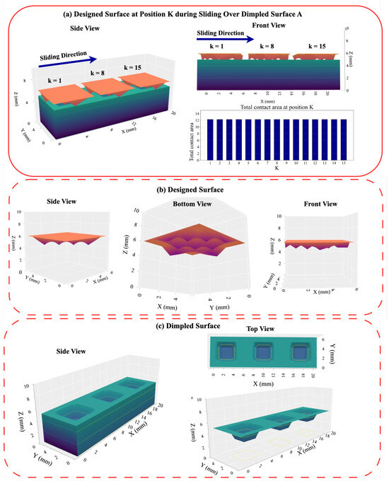(a) Contact area at different positions during sliding along X axes. (b) Views of the designed surface from different angles. (c) Views of the dimpled surface from different angles.