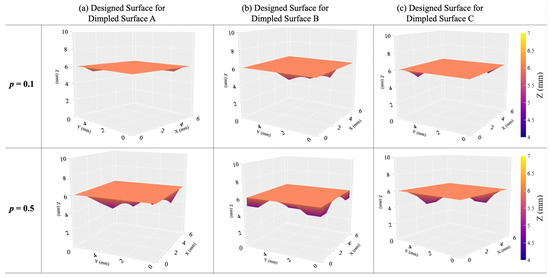 Figure 3 presents three dimpled surfaces, each with dimensions mm, mm. The shape and size of the dimples are different for each surface. We use the following values for model parameters, , , 7 mm, mm, mm. The material used in these surfaces is assumed to have a yield strength of 2 MPa. We impose full symmetry of the designed surface via constraints (7)–(9).