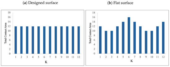 In order to demonstrate the advantage of using the proposed optimization model, we conduct the following experiment. We calculate the contact area between Surface A and a flat surface at different positions during its horizontal sliding. We assume that the flat surface has the same dimensions as the designed surface, mm, mm. Figure 7 presents the distribution of the total contact area between Surface A and the designed surface (Figure 7a), and between Surface A and the flat surface (Figure 7b). The overall total contact area is larger for the flat surface as compared to the designed surface. Additionally, the contact area for the designed surface is always the same—12 mm2—which presents a sturdier design as compared to the flat surface for which, at 4 (out of 12) positions, the contact area is 10 mm2.