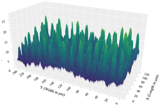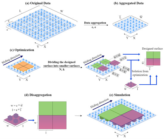 Consider that we are given the width and length of a surface, and the corresponding height, , for each point . We propose a mathematical model to design the texture of a new surface with dimensions ()—that is, to determine the height of each point . We refer to this as the designed surface. The objective of the proposed model is to minimize the contact area between the two surfaces and deformation during a linear sliding of the designed surface along the X axis in dry conditions.