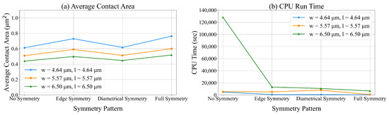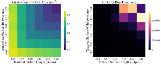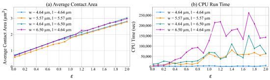 In constraint (16), changes in p impact . We tested the model for different values of between 0.02 μm2 and 2.0 μm2. In these experiments, we tested units designed surfaces with different dimensions: (4.64 m), (5.57 m), (4.64 m) and (6.50 m), and (6.50 m) and (4.64 m). Figure 12 presents the average contact area during simulation and the CPU time to solve the corresponding ILP models. Based on these results, increasing the value of p increases the average contact area for every surface. This increase is necessary to reduce surface deformation as unit load p increases. Figure 12b shows an increase in the run time of ILP with values of p, w, and l.