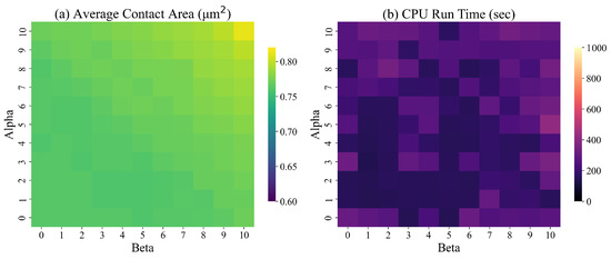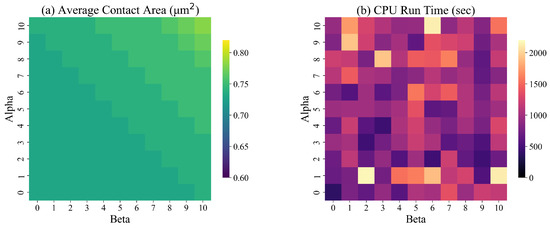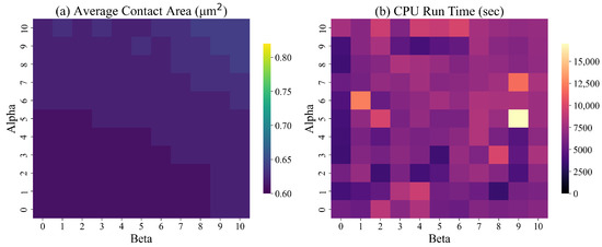In the objective function (10), the values of and affect the texture (smoothness) of the surface. We tested our solution approach for different values of and between 0 and 10 for designed surfaces with dimensions = 50 (4.64 m). Figure 13 presents the average contact during simulation and the run time of the ILP model for different combinations of and . Based on the results of these experiments, the average contact area increases with and . No discernible trend in CPU time is evident.