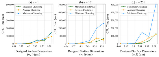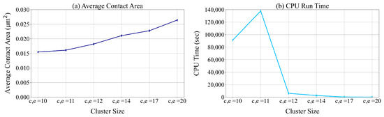 In Figure 18 and Figure 19 we present the average contact area and computational time for different values of We observe that the average contact area decreases and the CPU run time increases with the dimensions of the unit designed surface. Using the average of the data to represent the cluster (e.g., using (28) to determine ) results in the lowest average contact area. Using the average and minimum of the data to represent the cluster results in the lowest CPU run time.