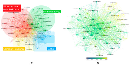 Thematic map of keywords: (a) Keywords map separated by relevant categories; (b) medium-entropy alloys and methodologies used for 2020–2024 [6].