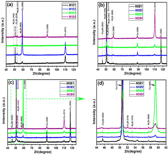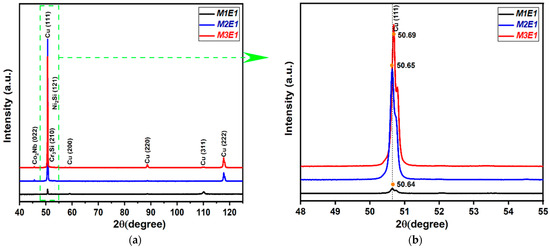 Figure 4 shows the XRD patterns of the medium entropy alloys (MEAs) in the as-cast state (E1). Figure 4a shows the X-ray spectra in the 2θ range from 40° to 125°, while Figure 4b shows an enlargement of Figure 4a in the 2θ range from 48° to 55°, allowing a detailed analysis of the (111) peak. In Figure 4a, it can be seen that alloys M1, M2, and M3 have mainly FCC phases (αCu) and precipitated phases (Co2Nb, Cr3Si and Ni2Si). It can also be seen that alloys M2 and M3 have high intentionality in the diffraction peak (111) [see Figure 4b]. This effect can be attributed to the preferential orientation of the Cu-rich matrix in the crystallographic direction. In addition, Figure 4b shows that the (111) peak underwent a significant change in the diffraction angle, with a slight shift to a larger angle from 50.64°, 50.65°, and 50.69° as the content of Nb increased. This behavior, linked to the addition of Nb, which causes the lattice parameter constant to decrease from 3.623 Å for the M1 alloy to 3.622 Å for M2 and 3.620 Å for M3. These lattice parameter values were calculated from the XRD results using Equations (7)–(9).