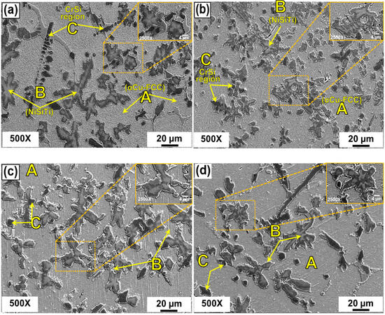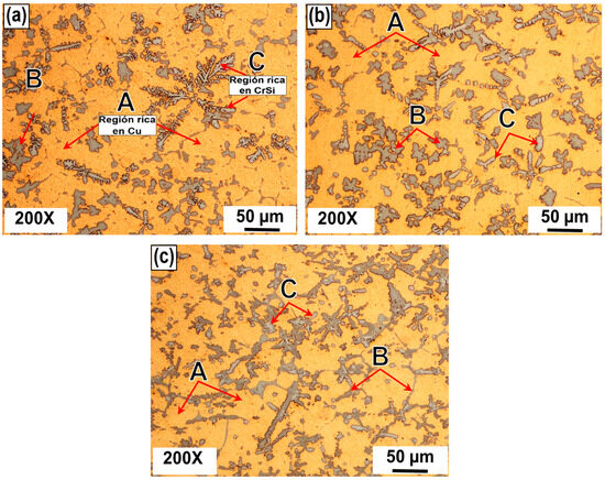 The cast microstructures shown in Figure 5 correspond to alloys M1, M2, and M3. Dendritic and interdendritic structures were observed in all alloys. All the alloys showed a dendritic structure composed of three phases, designated A, B, and C. The αCu-rich matrix is associated with the p hase A, which showed a decrease in its volume content with increasing Nb incorporation in alloys M2 and M3. Reducing the αCu-rich phase A increases the NiSiTi and CrSi-rich phases B and C, respectively. Moreover, the B phase is found at the margins of the dendritic arms of the C phase. By comparing Figure 5a–c, it is also possible to distinguish a gradual refinement effect in the microstructure owing to increasing Nb addition. Nb addition refines the microstructure, which is favorable for improving properties such as hardness and wear resistance.