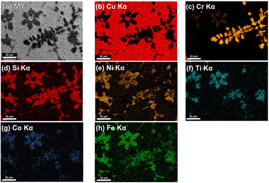 SEM-BSE image of (a) M1 alloy in as-cast condition (E1) and SEM-EDS elemental mapping images for (b) Cu Kα; (c) Si Kα; (d) Cr Kα; (e) Ni Kα; (f) Ti Kα; (g) Co Kα; and (h) Fe Kα from the same area as (a).