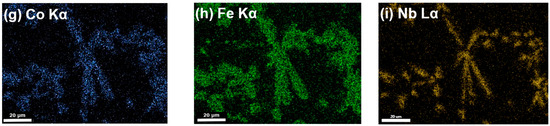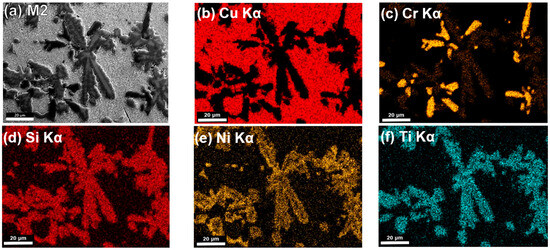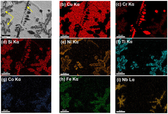 Figure 8a shows a secondary electron image of alloy M1, and images (b–h) correspond to the elemental mapping for (b) Cu Kα, (c) Cr Kα, (d) Si Kα, (e) Ni Kα, (f) Ti Kα, (g) Co Kα, and (h) Fe Kα, respectively, in the same area as (a). Similarly, Figure 9 and Figure 10 show the SEM-EDS elemental mapping for alloys M2 and M3, which includes the distribution of Nb in the figures labeled as (i). The figures reveal that phase A is predominantly Cu, phase B is composed of NiSiTi, and phase C is composed of CrSi. In Table 3, the average results of 10-point measurements of the EDS microanalysis performed on each phase are presented. As can be seen, Cu corresponds to 92.41 at% for average phase A. For phase B, the average sum of NiSiTi was 49.46%, and for phase C, the average sum of CrSi was present at 93.60 at%; was is mainly composed of CrSi.