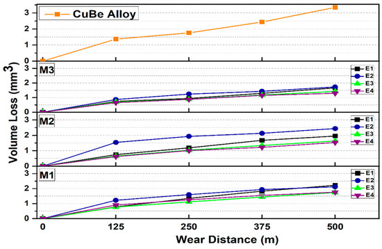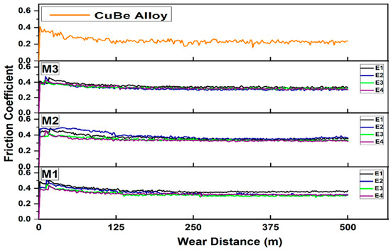 From the results obtained, it is important to emphasize that all the E1 samples presented the highest coefficient of friction (see Figure 14), but the behavior of the coefficient of friction after 125 m was stable; this was similar for all M1, M2, and M3 alloy samples.