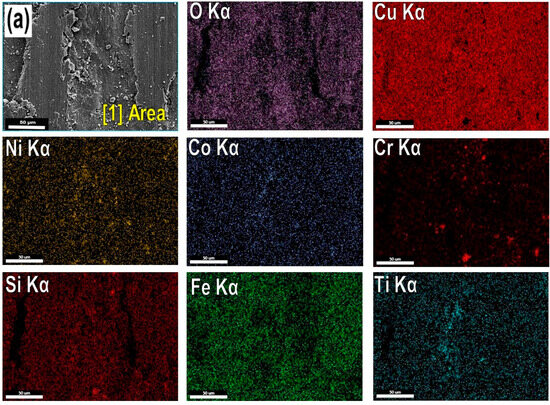 The SEM-SEI and SEM-EDS elemental mapping images in Figure 17 show the oxide layers formed on the surfaces of alloys (a) M1 and (b) M3, which are listed in Figure 15 as Areas 1 and 2. As discussed, the greater number of high-hardness particles within the soft and ductile matrix caused more surface damage and discontinuity in the oxide layer, resulting in more Cu alloy/steel ball contact. A stable and present oxide layer is essential for minimizing and stabilizing the friction coefficient, which helps reduce direct metal-to-metal contact and wear losses.