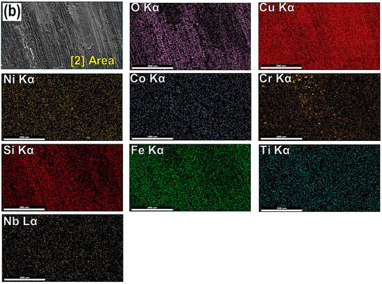SEM images of wear marks and SEM-EDS elemental mapping images of oxide scale formed on Area 1 of (a) M1 alloy and Area 2 of (b) M3 after the wear test from the same area marked in Figure 15a,c.