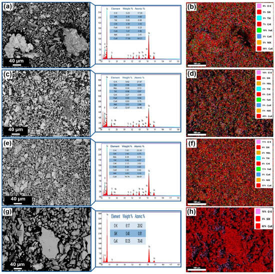 SEM micrographs and EDS mapping-Spectrum area of the wear debris collected from the samples in as-cast condition (E1): (a,b) M1; (c,d) M2; (e,f) M3; and (g,h) CuBe alloy.
