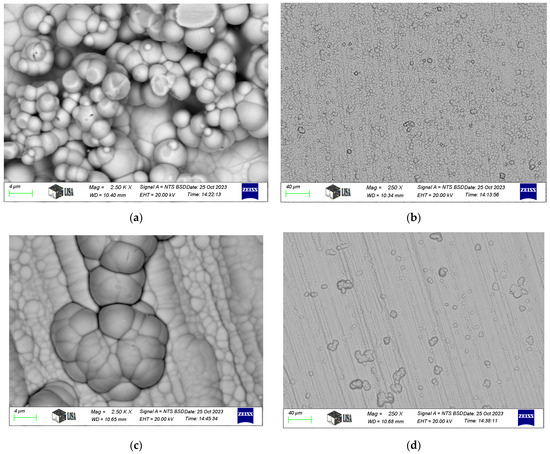 The morphological analysis of the coatings on the specimens was conducted using SEM. In addition to examining the coating morphology, the chemical composition of the surface was analyzed across a range of atomic numbers.