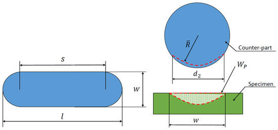A comparison of the measured data and the wear volume loss calculated according to DIN 51834-1 is performed [36]. The wear volume loss is determined as the wear of the test specimen and the counterpart is taken into account. The interpretation of the notations used for the calculation of the wear volume loss is illustrated in Figure 3.